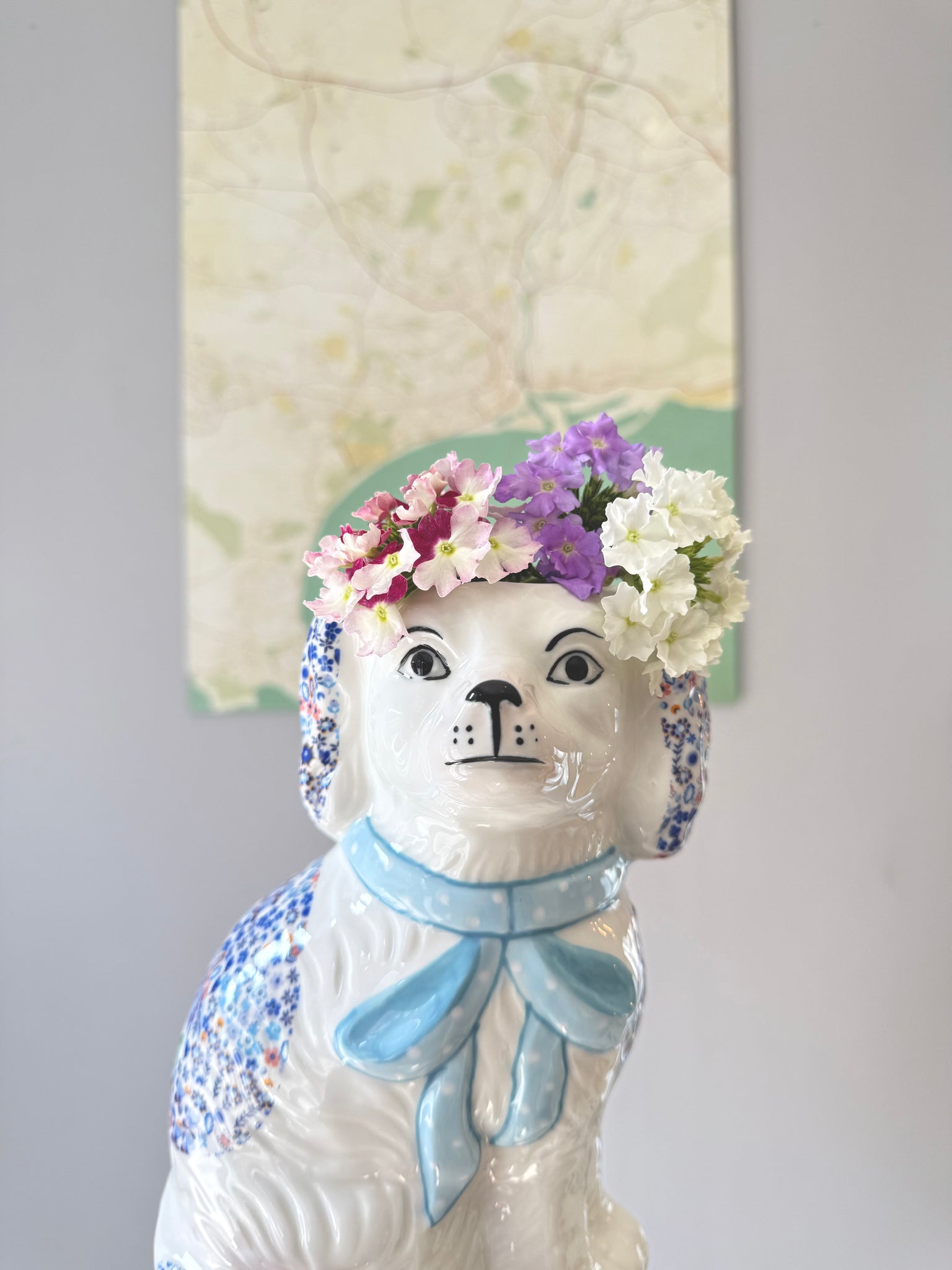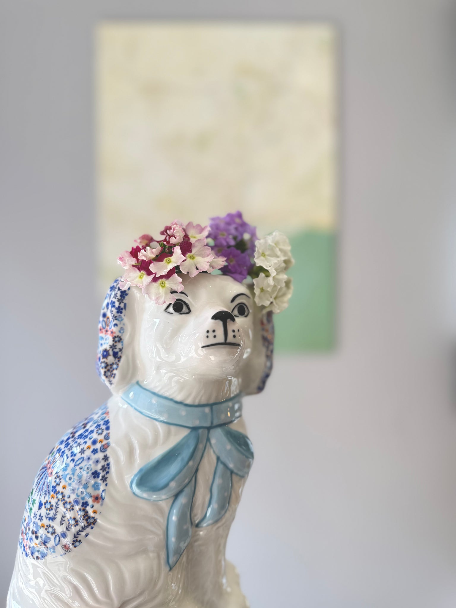 お花を生けていただくと、ドッグがお花の帽子を被っているように見えてとても可愛いです。