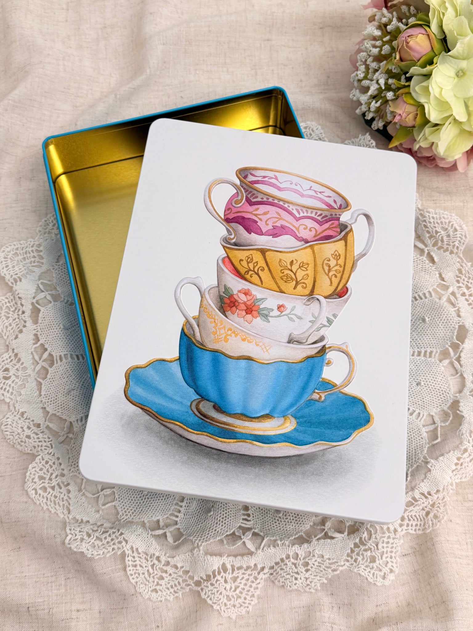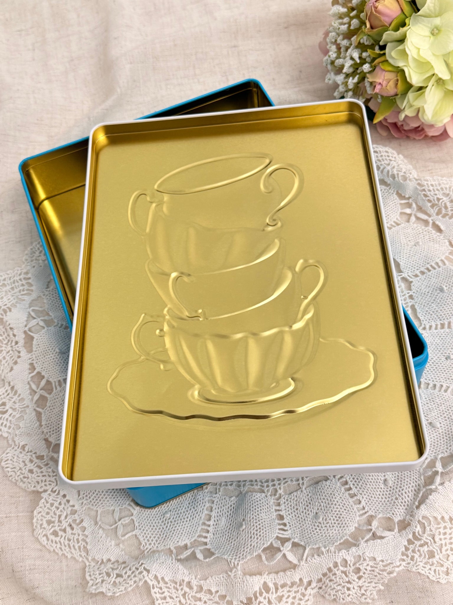 缶の本体部分は鮮やかなターコイズブルー、白地の蓋とのコントラストが印象的。