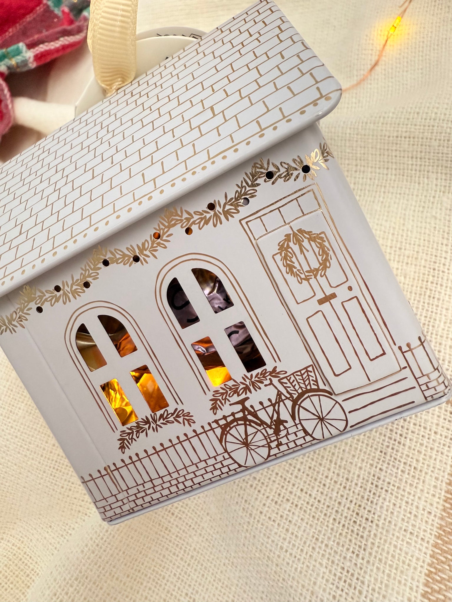 素敵なレンガ造りの家に、クリスマスツリーが描かれています。