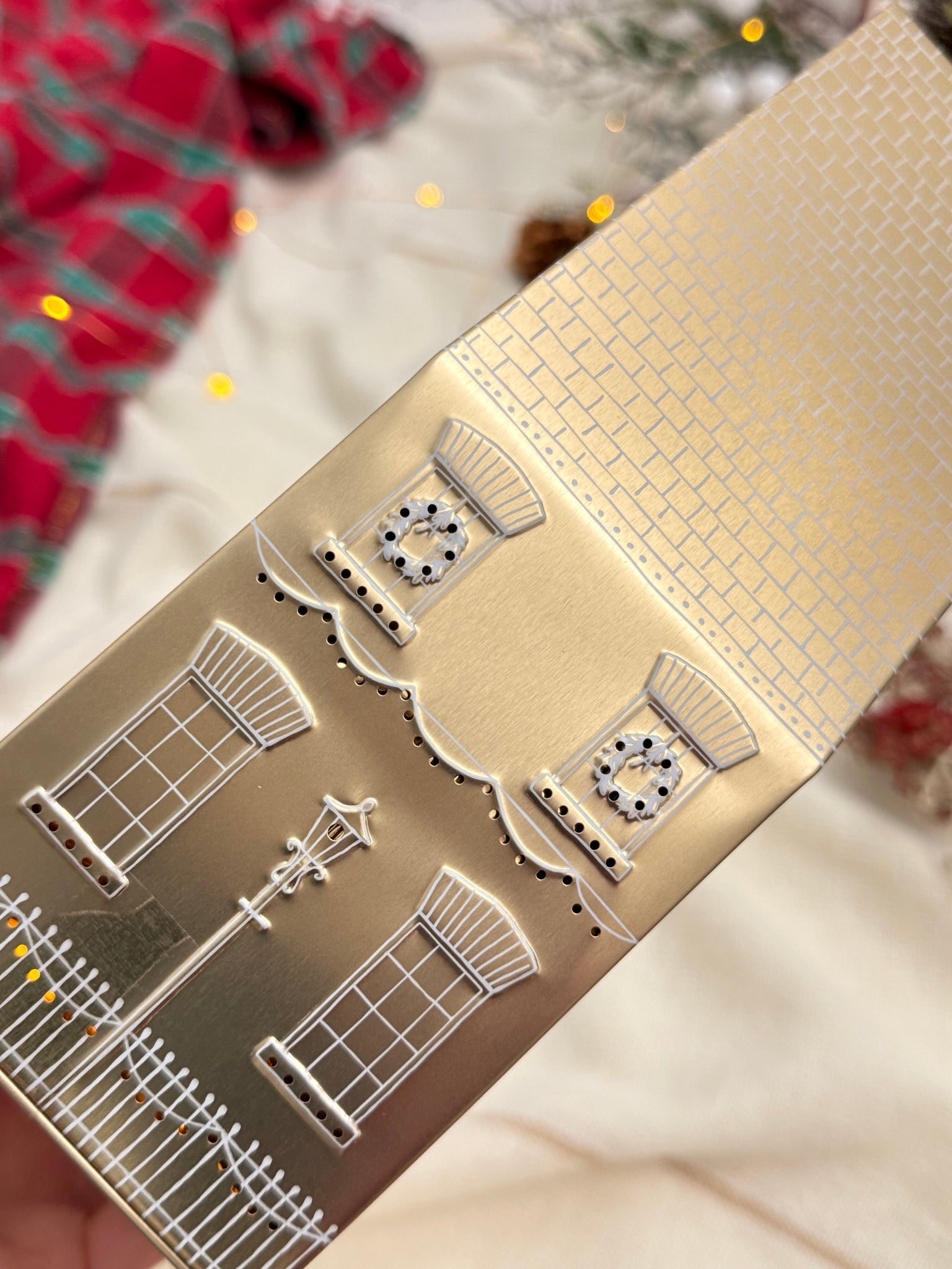 とても可愛らしいお家のデザインに、白で繊細にリースやヤドリギ、ツリーといったクリスマスのアイコンが描かれています。