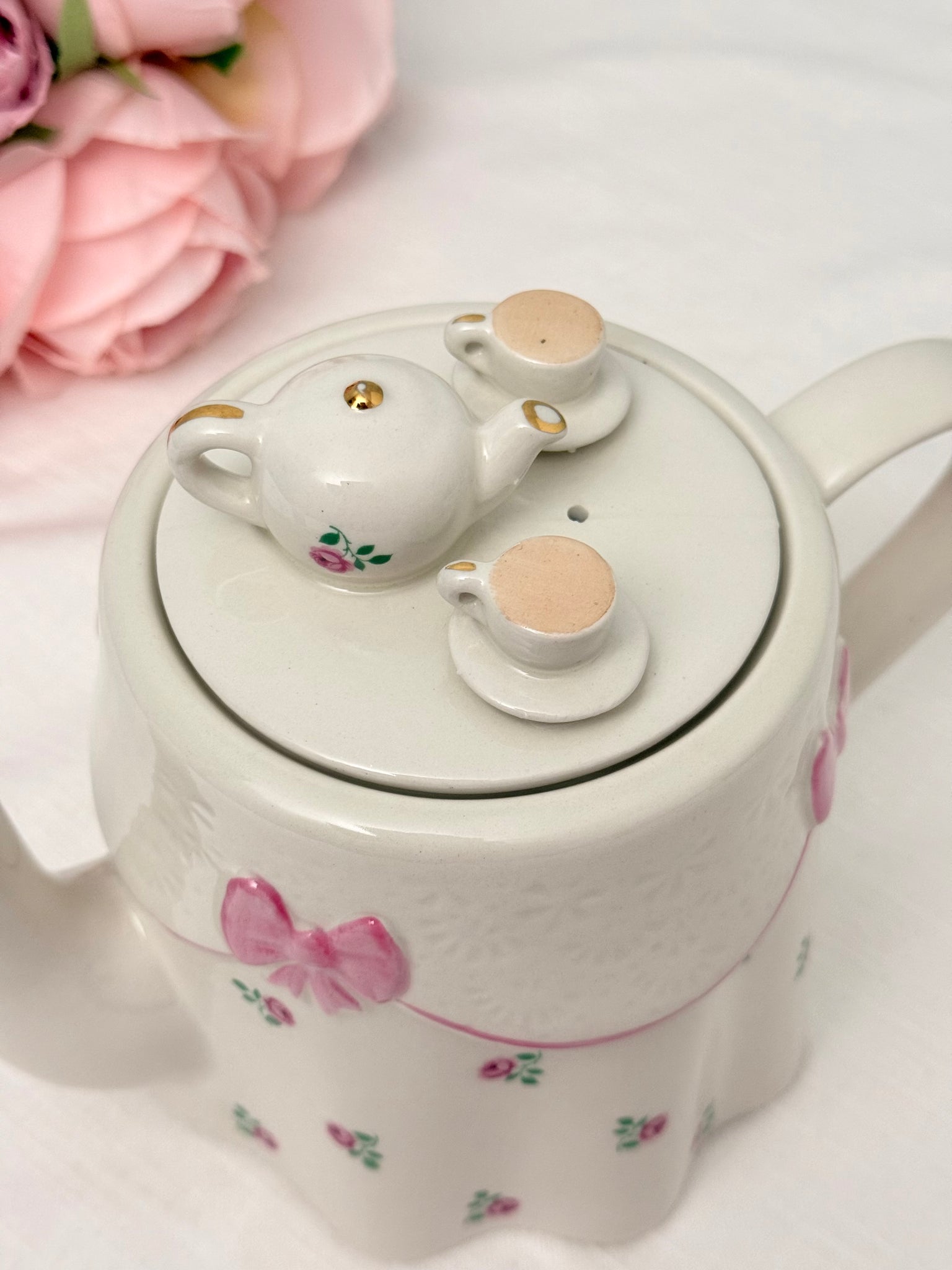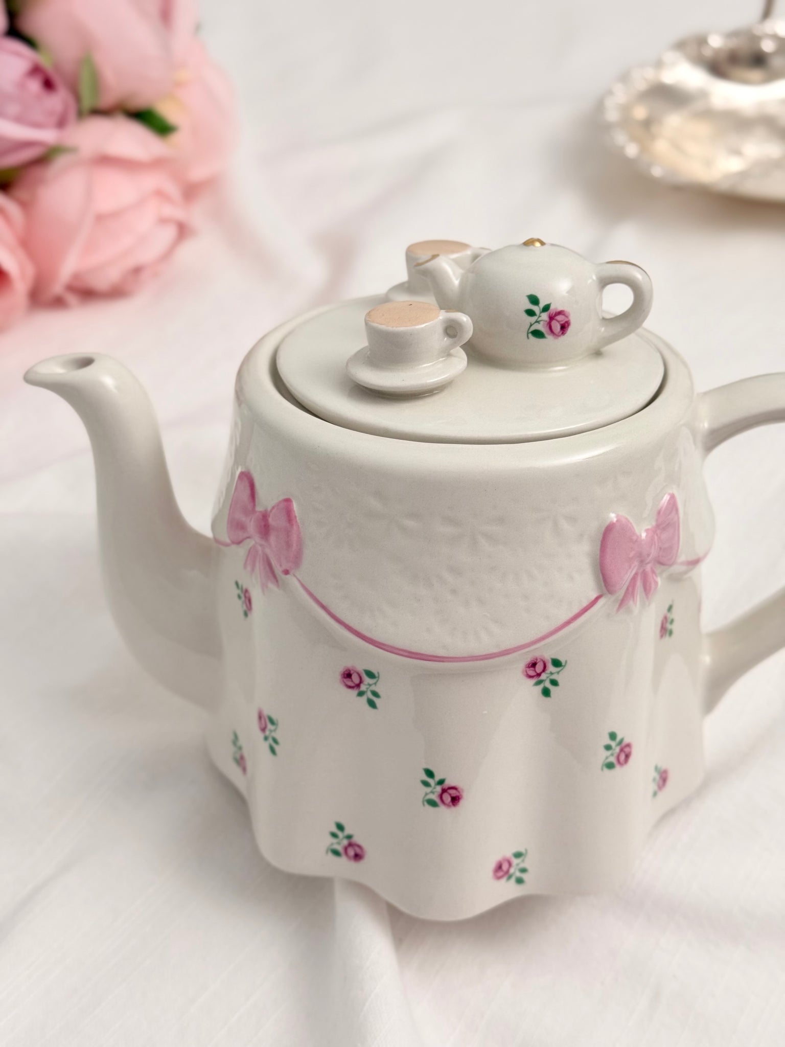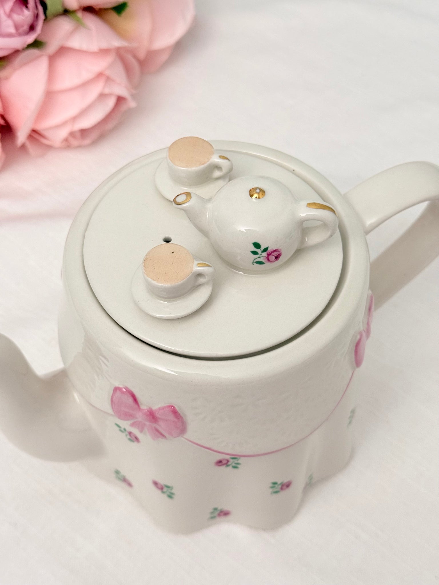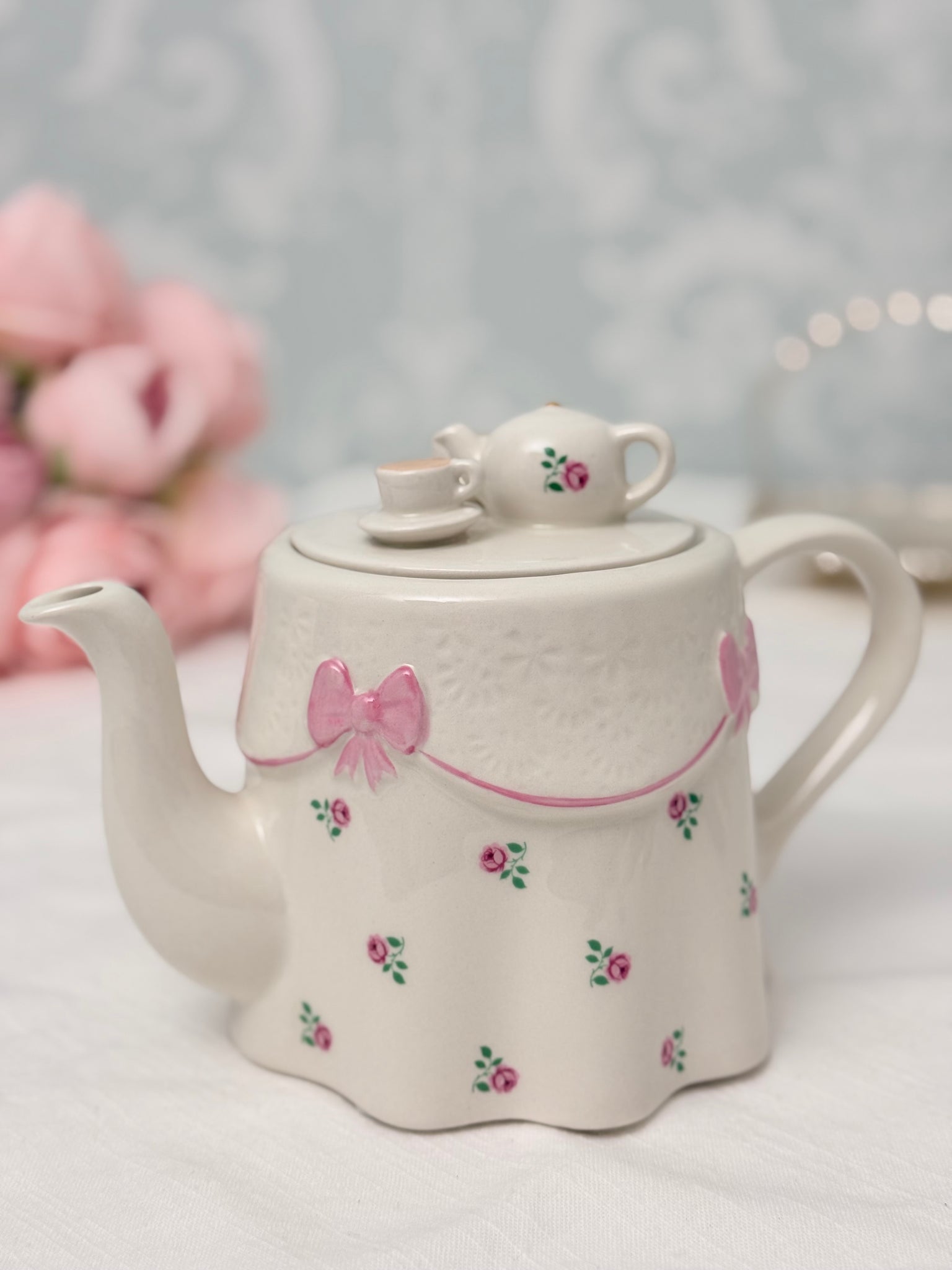 テーブルの上に置かれたティーセットによって、見事に素敵なティータイムが再現されたティーポット。
