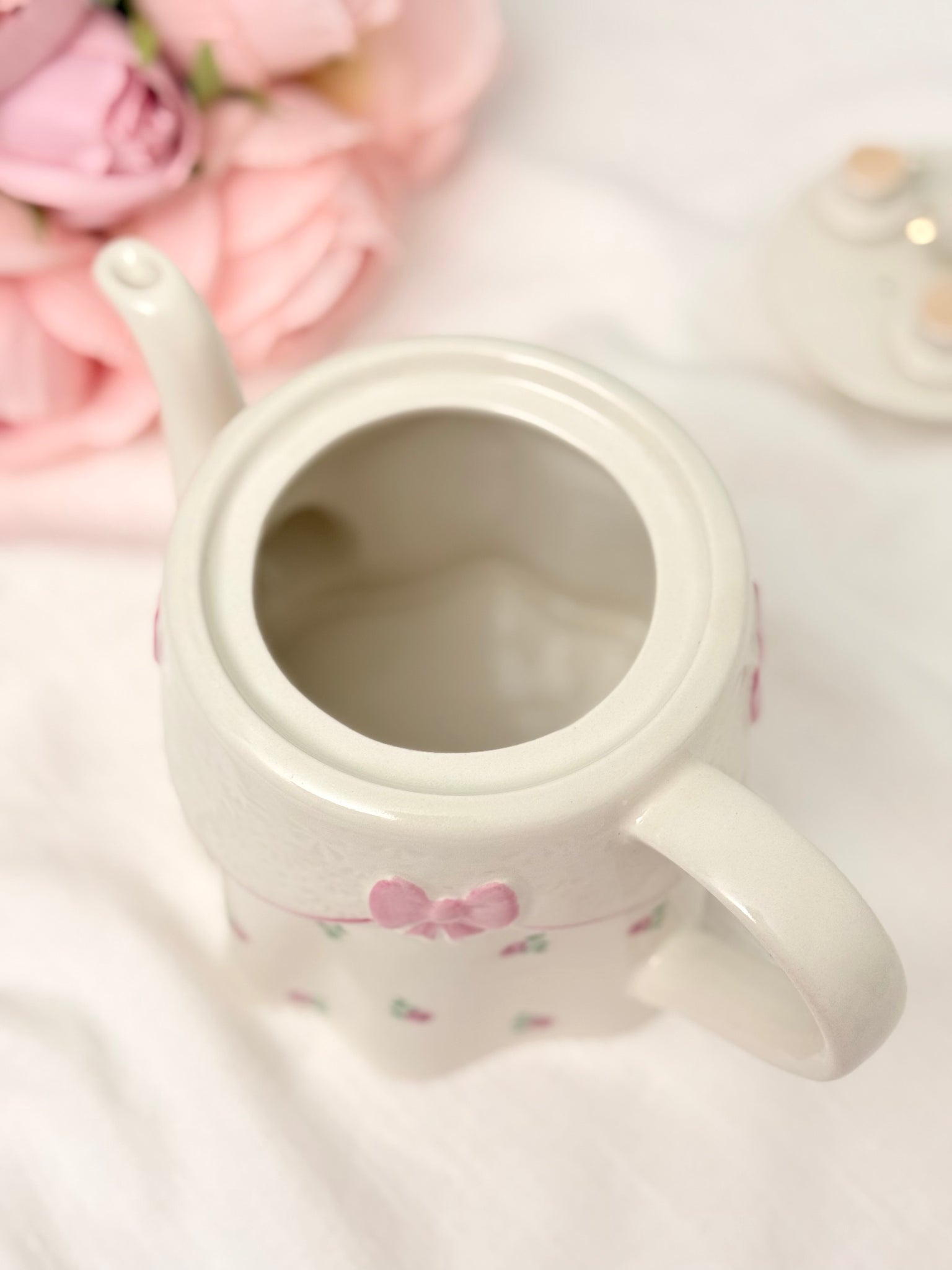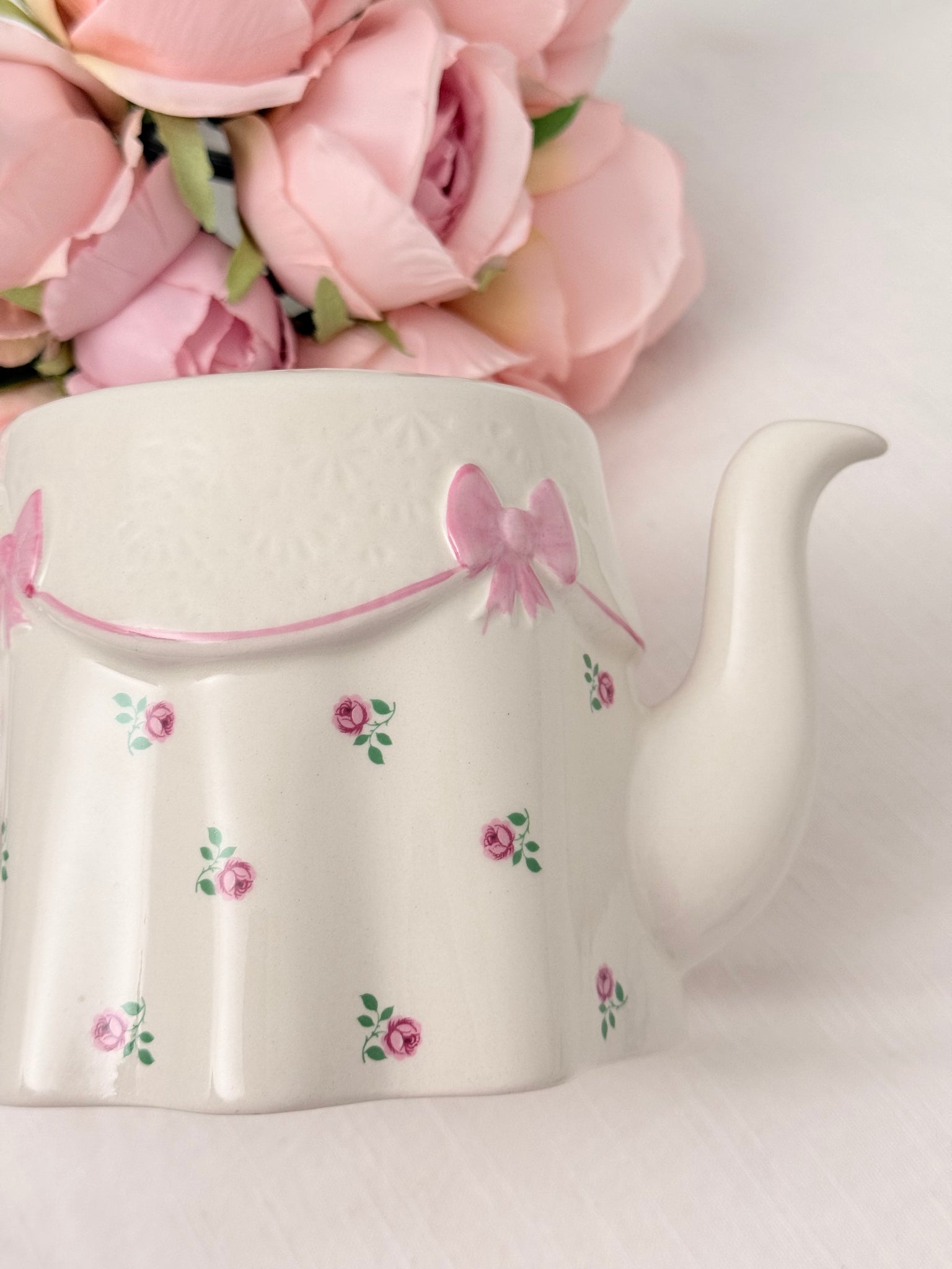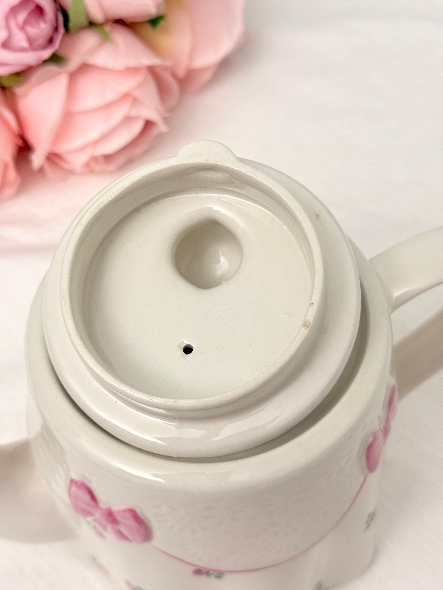 ポット本体にぐるりと一周大きなリボンがアクセントになったテーブルクロスがかけられています。また、クロスにはお花のエンボス加工が施されており、立体的な模様がついています。